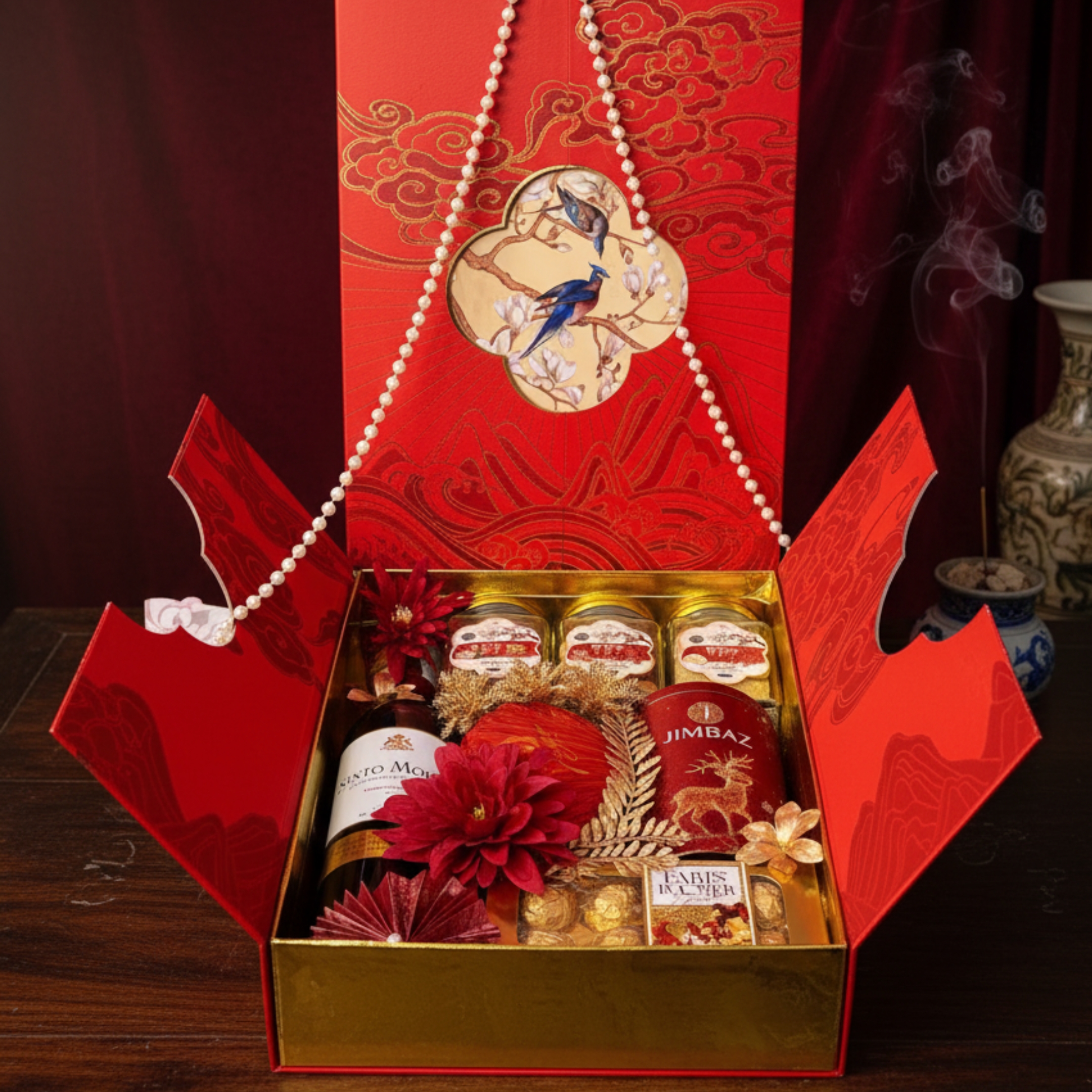 Vali đỏ sang trọng gồm vang, bộ hũ snack và bánh nhập khẩu.